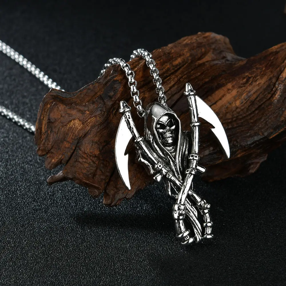 1.Name:Grim Reaper Death God Skull Sickle Necklace Vintage Pendants Friends Gift Neck Chain Kpop Punk collar for Men Women Jewerly